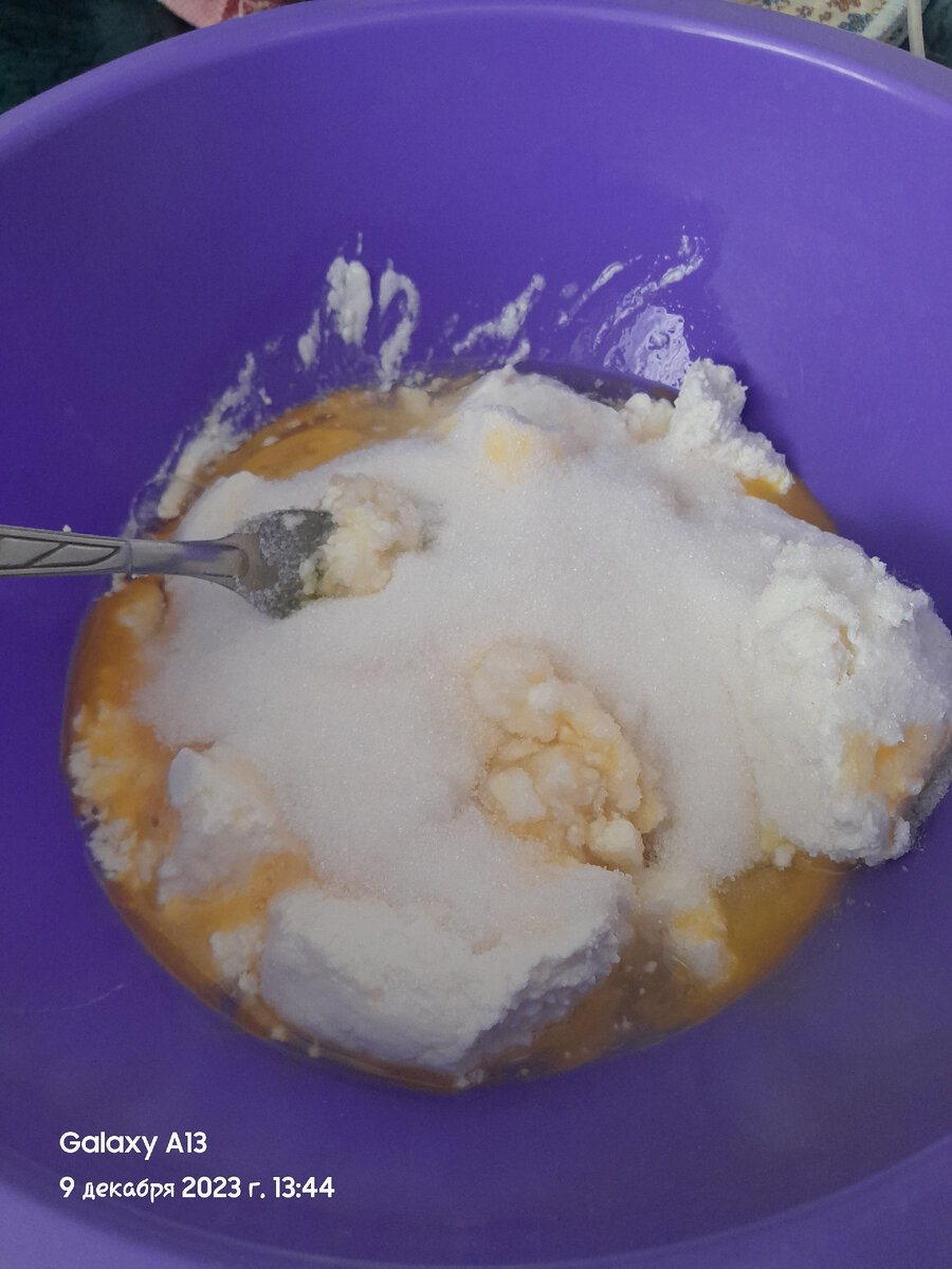 Сначала нужно смешать в миски 4 яйца и 500г творога также пол стакана сахара соиденяем и мешаем до однородной массы.