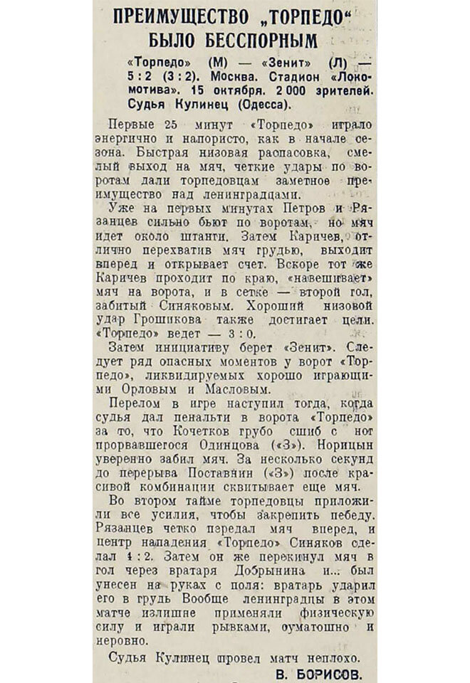 Примечание. Синяков во 2-м тайме при счёте 5:2 покинул поле из-за травмы. ПРЕИМУЩЕСТВО «ТОРПЕДО» БЫЛО БЕССПОРНЫМ Первые 25 минут «Торпедо» играло энергично и напористо, как в начале сезона. Быстрая низовая распасовка, смелый выход на мяч, четкие удары по воротам дали торпедовцам заметное преимущество над ленинградцами.