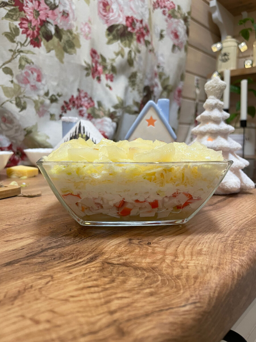 Ингредиенты: 1 банка консервированных ананасов, 1 пачка крабовых палочек, 4-5 яичных белков вареных, 2-3 зеленых яблока (лучше кисловатых), 150-200 г сыра