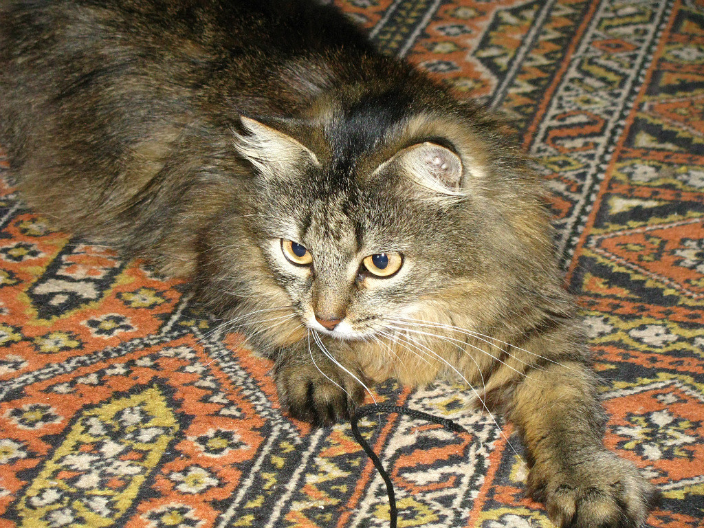 Конечно, Кусь стал всеобщим любимцем - избалованным и нежным созданием, предпочитающим дорогие сухие и влажные корма, любящим понежиться на свежевыстиранном белье или мягком пледе. На коврике он тоже не прочь полежать.