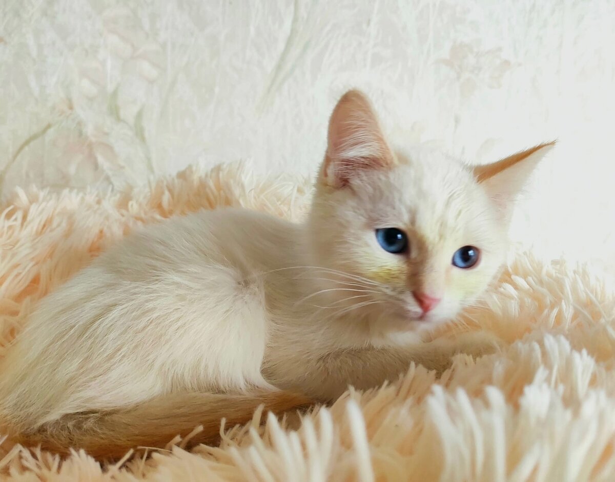 Окрас такой необычный. Цвет молочный с акцентами на ушках и хвосте. Он пушистик и добряк.