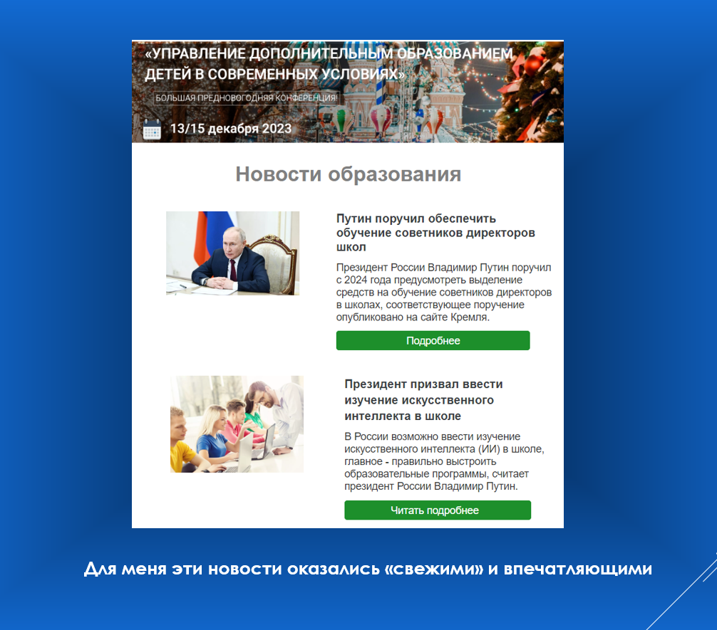 Возможно, это и не новости вовсе. Чем же эти новости меня «зацепили»? Во-первых, советники ("навигаторы детства"). Их обучали и в прошлом году, и в текущем. Причем не онлайн, а очно. Не просто очно, а с выездом в другие регионы. Проживание, проезд, пропитание – всё включено. А вот цитата из поручения первого лица государства: "Правительству Российской Федерации: предусмотреть начиная с 2024 года выделение Минпросвещения России бюджетных ассигнований из федерального бюджета на осуществление мероприятий по обучению лиц, замещающих в образовательных организациях должности советников директоров по воспитанию и взаимодействию с детскими общественными объединениями". Заметили, что в поручении имеется фраза «НАЧИНАЯ с 2024 года». А в 2023 советники за чей счет учились? Во-вторых, ИИ в школах. Да он уже давно и прочно поселился в нашем образовании! Все эти бесконечные тесты-олимпиады, электронные тетради - это и есть ИИ в действии. Некоторые ученики не только сочинения пишут с помощью искусст