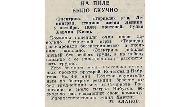 Игру оживило лишь несколько отличных бросков вратарей Кочетова и Набутова. На 4-й мин. Кочетов изумительным по быстроте реакции броском отбил труднейший мяч от Смирнова. Расчетливо и смело сыграл Набутов, несколько раз спасавший свою команду. Удовлетворительно судил Хавчин. М.Аланов. «Красный спорт»