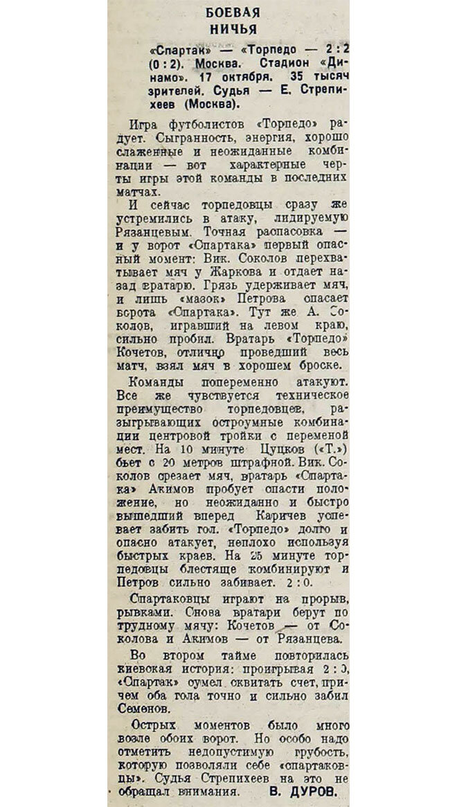 Примечание. Матч был перенесён с середины июля на середину октября из-за мероприятий, посвящённых Всесоюзному дню физкультурника. БОЕВАЯ НИЧЬЯ Игра футболистов «Торпедо» радует. Сыгранность, энергия, хорошо слаженные и неожиданные комбинации вот характерные черты игры этой команды в последних матчах.
