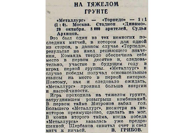Примечание. В прессе нет инициала игрока «Металлурга» Зайцева. Условно записано, что это Алексей. НА ТЯЖЕЛОМ ГРУНТЕ Это был одни из тех немногих последних матчей, в котором для одной из сторон, в данном случае «Торпедо», результат не имел решающего значения. Команда твердо обеспечила себе место в первом десятке и, следовательно, участие в будущем году в играх первой группы. «Металлург» в случае победы получал основательные шансы на место в первой пятерке. Поэтом