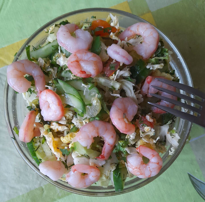 Для меня такое количество салата - 2 порции. В каждую кладу 1 ст. л. креветок.