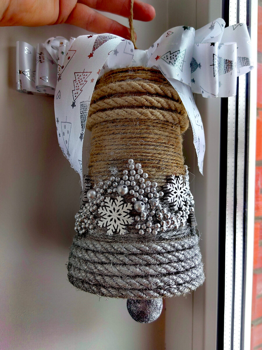 Когда бабушка не ищет легких путей😂,хотя изначально использована всего лишь пустая пластиковая банка. Но надо же было заморочиться, дополнительные идеи возникли по ходу создания колокольчика. В ход пошли запасы бусинок, джутовой верёвки,остатки деревянных снежинок от гирлянды(они в центре джутовых бантиков) , а также елочные пластиковые шарики и упаковочная лента из Фикс прайса. Колокольчик серебристый – Только тронь его слегка, И услышишь голос чистый, Как вода из родника...