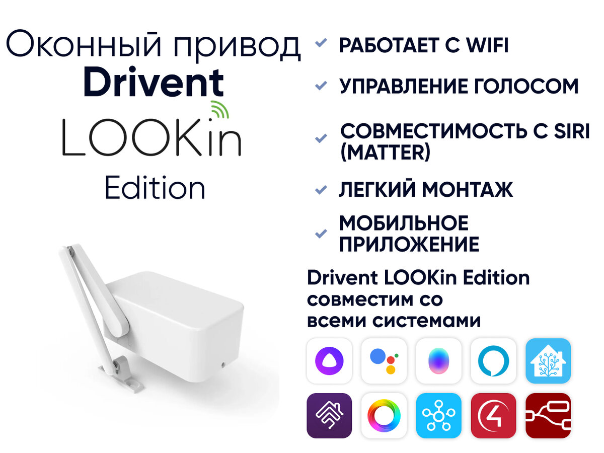 Оконный привод Drivent предназначен для управления проветриванием. Может работать как самостоятельное устройство или быть интегрирован в системы умного дома. Основные технические характеристики: Есть два основных варианта установки: 📌 Вариант №1 - установка на место штатной ручки открывания окна В таком варианте ручка устанавливается в нужное положение и демонтируется. На ее место устанавливается привод и делает всю работу за вас. Минус данной установки - невозможность закрыть окно штатной фурнитурой, прижим будет осуществлять привод, что может не устроить тех, у кого за бортом суровый климат и сильные морозы. 📌 Вариант №2 - установка на верх створки окна с сохранением штатной ручки Преимущественно используется для режима проветривания (положение ручки вверх). Из недостатков - необходимо сверлить и окно и раму (4 отверстия), из плюсов - возможность закрыть на штатную ручку. Интеграции Устройство нативно, без шлюзов, интегрируется в системы HomeKit, Home Assistant, Swiitch (Алиса, Мар