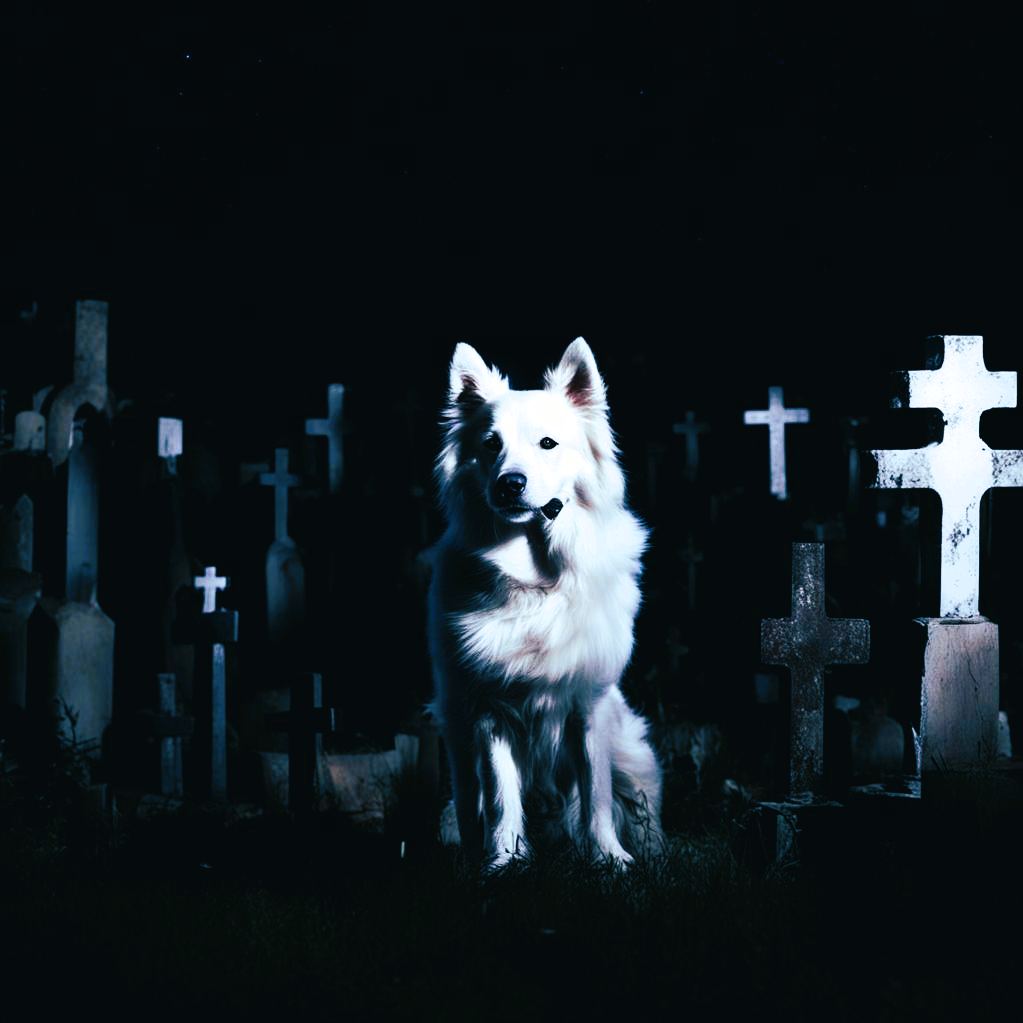 И только я выпустил руку Насти, а потом потянулся к ней, вот-вот наши губы должны были сомкнуться, как вдруг...снова услышали протяжный вой собаки. Настя отпрянула, вой повторился и нам показалось, что стал он ближе. И вот уже он со всех сторон...Настя снова схватила меня на руку и потянула за собой, на выход. И вдруг мы застыли, как вкопанные: в темноте, между крестов, мы увидели белую собаку. Она сидела неподвижно и смотрела на нас, а вой, как будто шел из под земли.