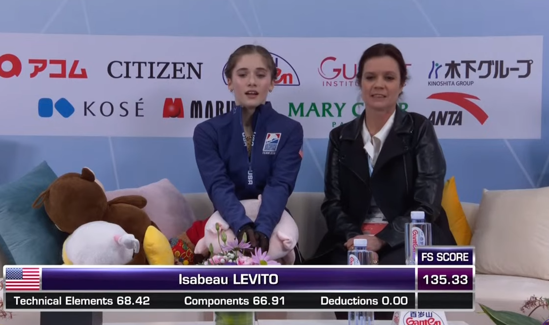 Решила я всё-таки глянуть на выступления зарубежных фигуристок после нашего Кубка Первого канала среди юниоров. Мою реакцию на международный финал гран-при невозможно было описать. Зачем я это смотрю? Это какая-то страшная деградация женского фигурного катания, но этой деградации все рады и готовы сделать всё чтобы это продолжалось. Уровень очень низкий и он стремительно катится в бездну. Если у нас девчонок ругают за то, что мало четверных или тройных акселей, то там каскад 3-3 это уже что-то невообразимое. Изабо Левито(США) Изабо совсем не поражает стабильностью в программах. Я предположу, что техника прыжка у неё хромает и от этого нет уверенности в их исполнении. А начнутся изменения в фигуре будет совсем уж нелегко. Она очень сильно прогибает спину при заходе на прыжок. Особенно это заметно в каскадах. Например, в произвольной программе первым же элементом идёт каскад 3Lz+3Т (недокрут). Там это прогибание очень ярко выражено. Она молодец, что в произвольной собралась и смогла исп