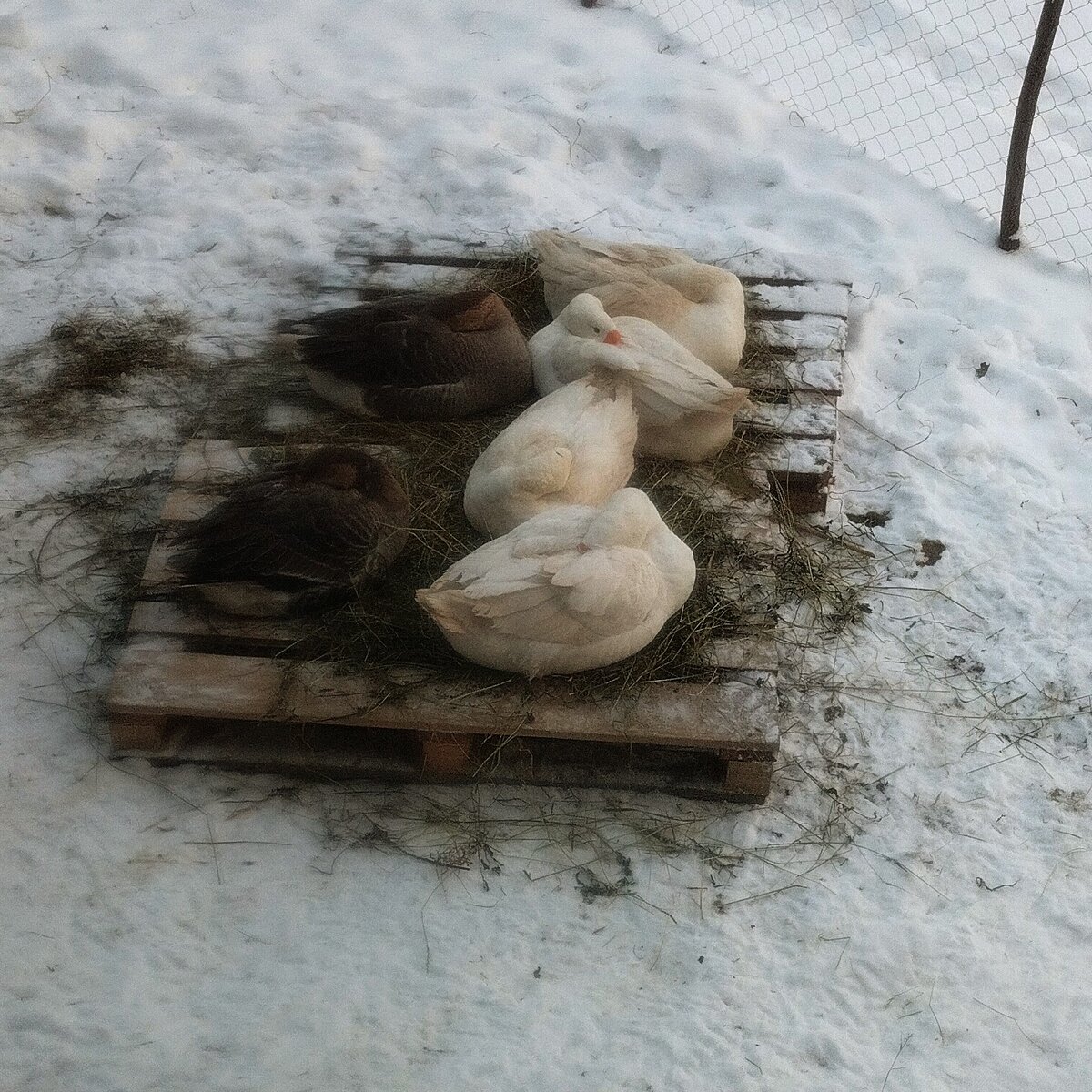 Во дворе у меня поддоны, на них сено. Напились, умылись и укладываются на эти поддоны. Лежат, жуют, чистят перья, иногда с громким ором встают, бычат друг на друга и снова укладываются на настил.