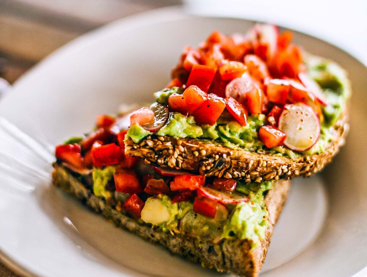 - ломтик хлеба с пастой из авокадо, творог с редисом и зеленым луком;