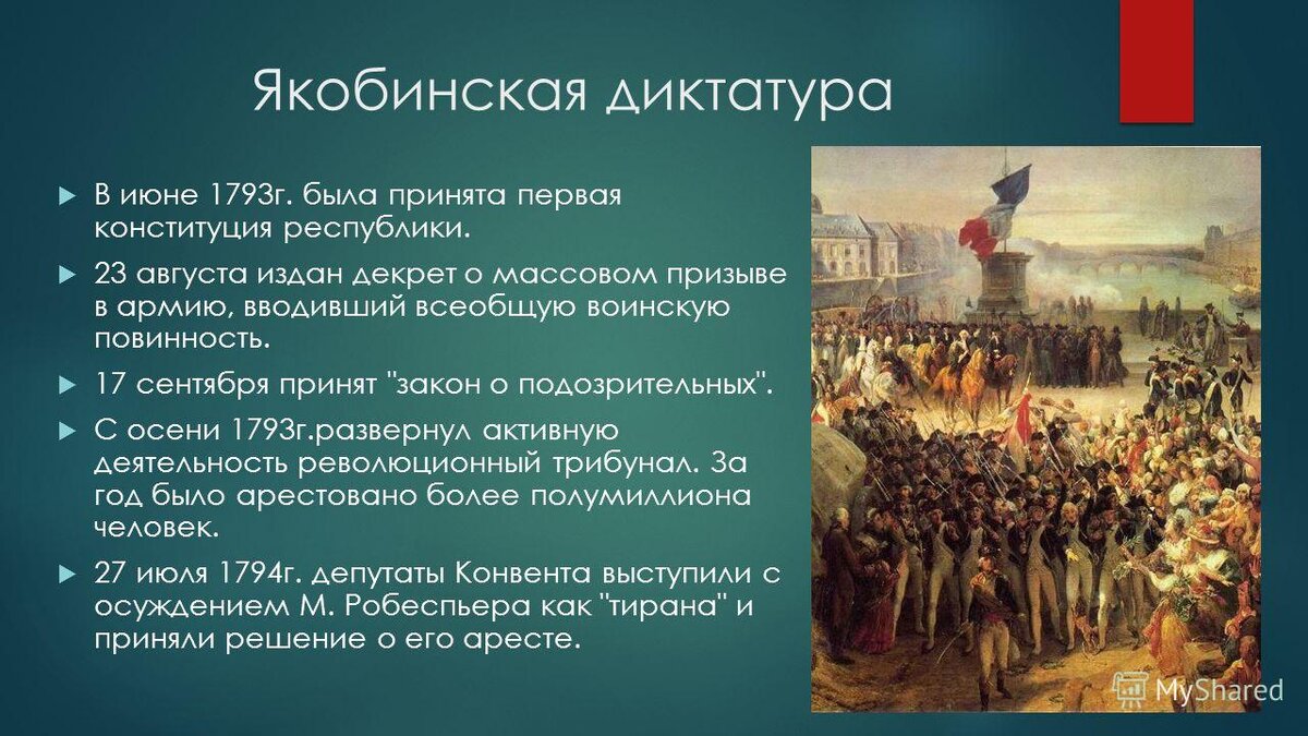 1789 жылы басталған Франциядағы революция - буржуазиялық өзгерістерді еңгізу үшін ұзақ күрделі кезеңдерден өтті. Мемлекет - абсолюттік монархиядан - конституциялық монархияға; конституциялық монархиядан - республикаға көшті. Конституция бірнеше мәрте қабылданып, бірнеше мәрте өзгертілді. Революцияның бірінші кезеңінде(1789-1792 жж.) - азаматтық теңдікті орнықтыруда түрлі декларациялар мен декреттер қабылданғанымен, ірі феодалдық топтардың билігі әлісремей - ірі буржуазияға айналып үлгерді. Шаруаларға - шіркеу мен король, ірі феодалдық топтардың жері беріледі дегенімен - жер қымбатқа сатылып, шаруалар жер ала алмай қалды. Шаруалардың наразылығы пайда болды. Революцияның екінші кезеңінде(1792-1793) - корольдің шетелге қашуға жасалған сәтсіз әрекетімен - сот процесі басталды. Францияда монархияны қалпына келтіру үшін - шетелдік интервенция басталды. Елде әлеуметтік-саяси қақтығыстардың нәтижесінде - "құтырғандар" тобы пайда болды. Бұлар Якобшылдердің тобының солшыл қанаты болды. Яғни, әл