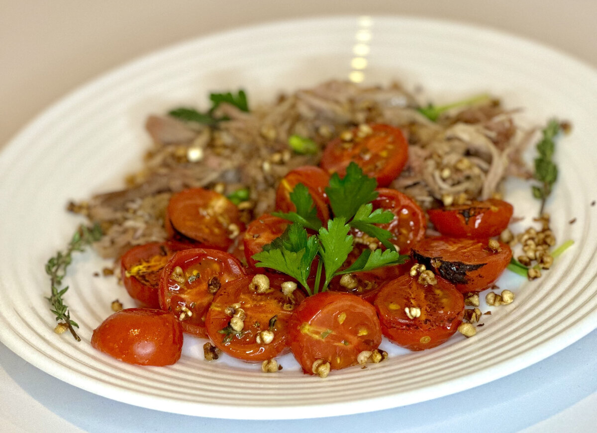 Запекать томаты нужно тоже правильно. По ним должно быть видно, что они запеченные, но одновременно с этим они должны прекрасно держать форму. В идеале ставим на 200 градусов на 3-5 минут и готово.