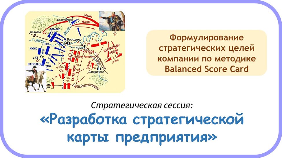Конец старого года и начало нового года – лучшее время для переосмысления и «оцифровки» стратегии компании в виде стратегической карты и ключевых бизнес-индикаторов деятельности организации. Мы можем сделать это по уникальной профессиональной методике на стратегической сессии в составе управленческой команды вашего предприятия и не только разработать стратегическую карту по технологии BSC, но и сформулировать на ее основе тактические цели и показатели компании на 2024 год. Продолжительность сессии: 1 день (8-10 часов). Состав участников: собственники и директора предприятия; руководители структурных подразделений. Количество участников: 4-20 человек. ЭТАПЫ И ЗАДАЧИ СЕССИИ: Этап 1. Вводная лекция «Разработка стратегической карты предприятия». Этап 2. Сбор идей и предложений для формулирования стратегических целей компании. Этап 3. Разработка стратегической карты. Этап 4. Формирование портфеля проектов и поручений. Этап 5. Обработка результатов сессии и разработка стратегической карты пр