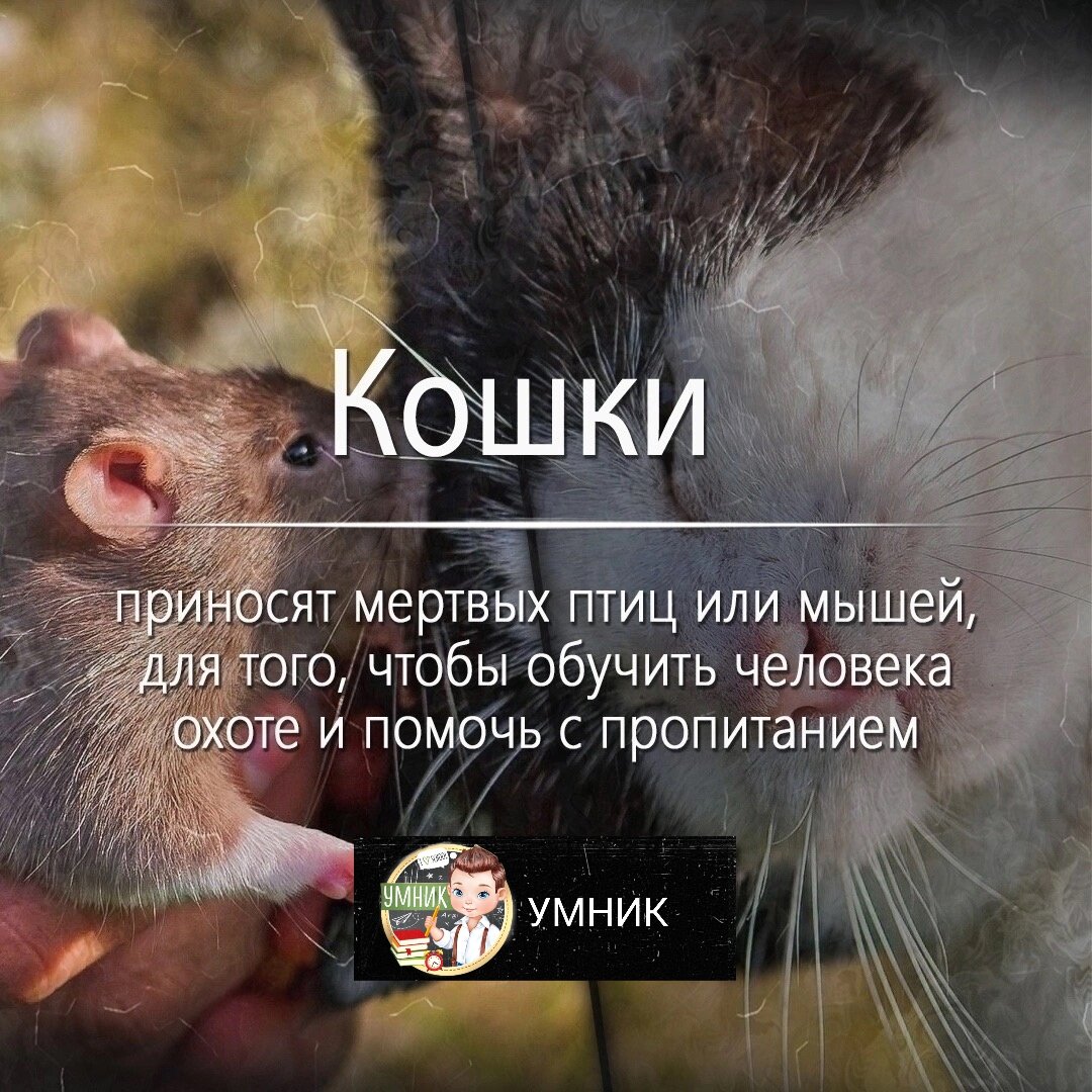 Некоторые кошки, особенно те, которые проводят много времени на улице, могут иногда приносить своим владельцам мёртвых птиц или мышей. Это поведение является инстинктивным для кошек, которые могут пытаться обучить человека охоте и помочь с пропитанием. Они могут считать, что хозяин неспособен самостоятельно поймать еду и поэтому пытаются помочь, так как они видят своего человека как свою семью. Кошки всегда будут кошками и иногда их поведение может казаться непонятным, но это ещё один способ, которым они проявляют заботу и внимание к своим хозяевам.