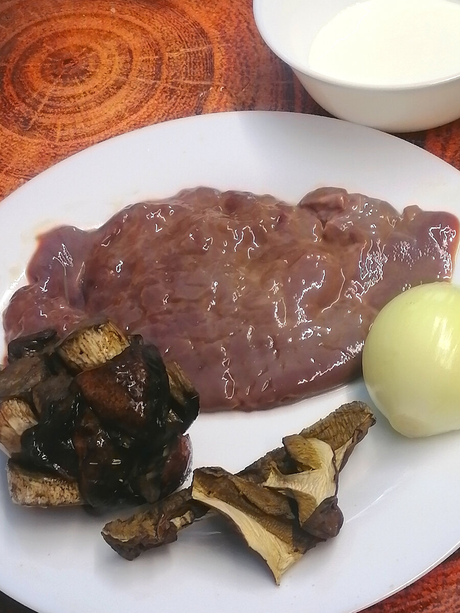Печенка обожает сливки. Это очень гармоничная пара. Вкус получается нежным и глубоким уже в данном сочетании. Но грибы придают им дополнительное очарование. Это классическое блюдо. Но я чуть изменила рецепт. Вроде мелочь, но, поверьте, она играет значительную роль. Секрет простой: я беру не один, а два вида грибов. Свежие (или замороженные) и сушёные. Вкус получается неизбитым, глубоким, интересным. Для этого блюда я беру: Ингредиенты: - печенка, - сливки нежирные, - лук репчатый, - грибы лесные свежие или замороженные, - грибы лесные сушёные, - сливочное или растительное масло для обжарки. Печенка подойдёт любая. Даже самая простая свиная, как у меня. Если нет сливок, то можно взять и сметану, но желательно очень свежую, не кислую. И её надо развести водой или молоком. Печенка требует предварительной обработки. Её надо вымочить в молоке и отбить. Как я это делаю написала вот тут: Пока печенка вымачивается измельчаю сушёные грибы. Заливаю их третью всех сливок, разведенн