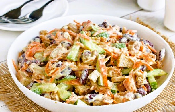 Продукты (на 4 порции) Переложите куриное мясо в миску. Влейте соевый соус, всыпьте паприку и соль. Перемешайте. Затяните миску с куриным филе пищевой плёнкой и отправьте в холодильник на 1 час. Обжарьте филе на сильном огне по 3 минуты с каждой стороны. Затем накройте сковороду крышкой и жарьте филе на небольшом огне ещё 8-10 минут. Готовое куриное мясо переложите со сковороды на тарелку. Затем куриное мясо нарежьте небольшими кусочками. Огурец вымойте, обрежьте края. Нарежьте огурец соломкой. Сюда же добавьте морковь по-корейски, отжав её от сока. Если полосочки моркови слишком длинные, разрежьте на более короткие части. С консервированной красной фасоли слейте жидкость. Фасоль промойте небольшим количеством воды от остатков жидкости. Обсушите фасоль на листе бумажного полотенца, а после переложите к ранее соединённым ингредиентам салата. Добавьте майонез, всыпьте соль и чёрный молотый перец. Салат перемешайте.