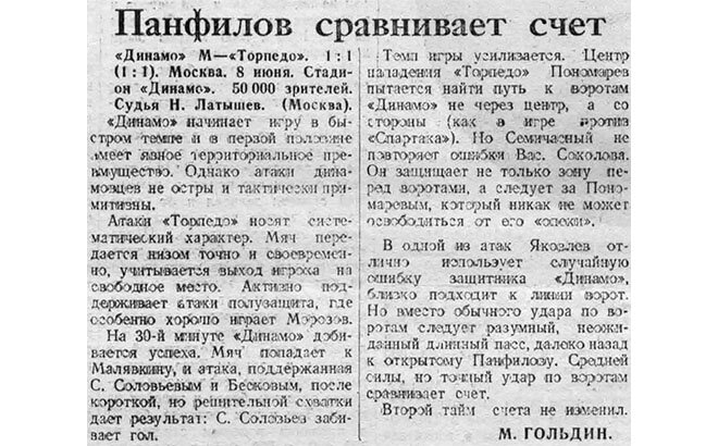 Голы: 0:1 С.Соловьёв (30), 1:1 Панфилов (43). ПАНФИЛОВ СРАВНИВАЕТ СЧЁТ «Динамо» начинает игру в быстром темпе и в первой половине имеет явное территориальное преимущество. Однако атаки динамовцев не остры и тактически примитивны.