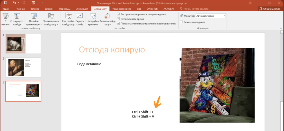 Чтобы быстро оформлять презентации и не тратить на них кучу времени, попробуйте копировать стиль любых объектов. В программе предусмотрены горячие клавиши, которые помогут копировать оформление любого объекта.