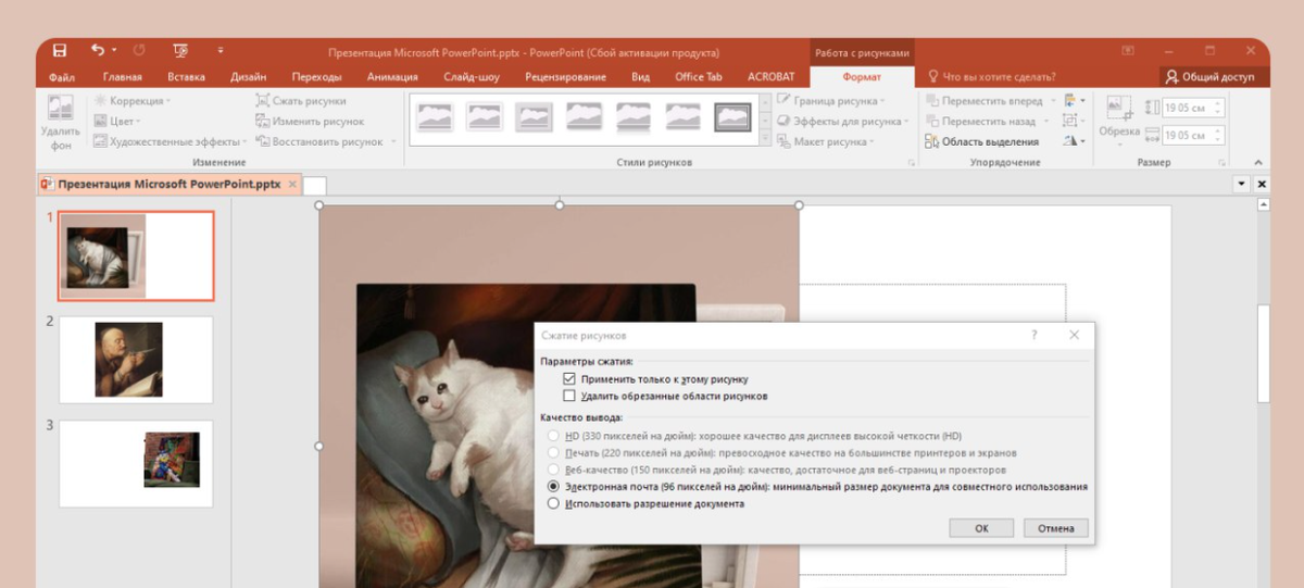 Обычно выясняется, что проблема — в большом количестве фотографий или картинок. Но пройтись еще раз по презентации и уменьшить каждую картинку отдельно — это слишком долго. К счастью, есть способ попроще.