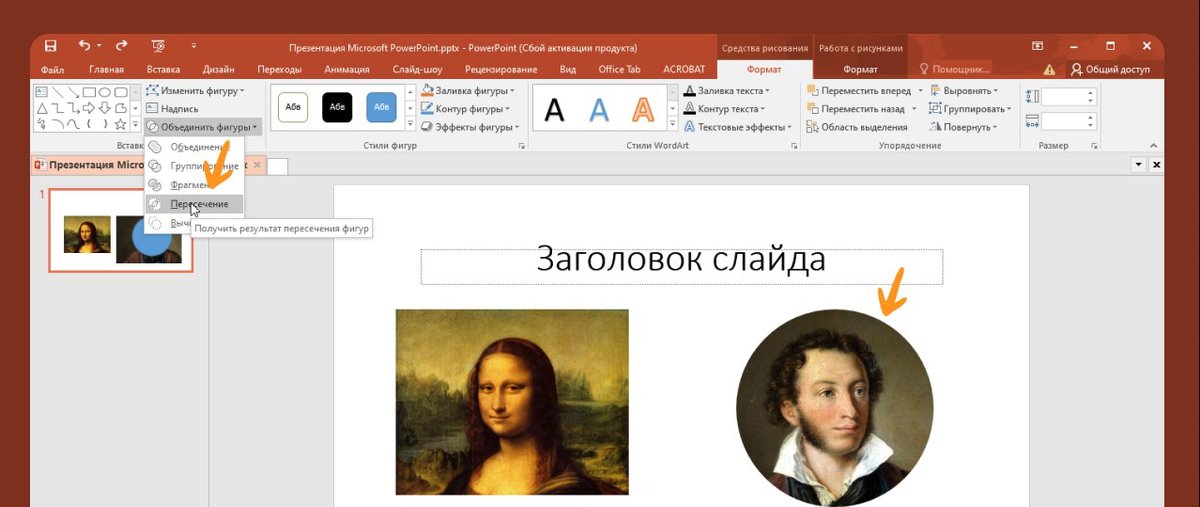5. Перейдите во вкладку «Формат» и нажмите «Объединить фигуры» → «Пересечение».