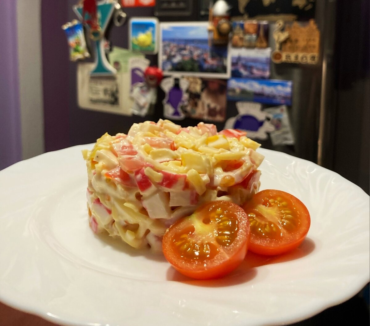 Всем привет! В скором времени Новый год! Пора делиться рецептами любимых салатов. На нашем новогоднем столе частые гости уже классические салаты "Оливье" и "Сельдь под шубой". В этом году решили поэкспериментировать и приготовить максимально простой, но вкусный и быстрый салат. Для его приготовления нам понадобятся: Для начала нарезаем кубиком крабовые палочки. В идеале, чтобы все ингредиенты (кроме сыра и чеснока) были одного размера. Также поступаем с болгарским перцем. И помидорами черри. Чеснок можно мелко нашинковать ножом или воспользоваться чеснокодавилкой. Сыр натираем на крупной тёрке. Осталось только смешать все ингредиенты в салатнице. Обильно заправить майонезом, посолить и поперчить по вкусу. Если не любите майонез - можно использовать сметану или греческий йогурт, но с мазиком вкуснее :) Вуаля! Перемешиваем до однородности и выкладываем порционно через кулинарное кольцо. На весь рецепт новогоднего салата мы потратили от силы 5-10 минут. Очень помогает тот факт, что ничег