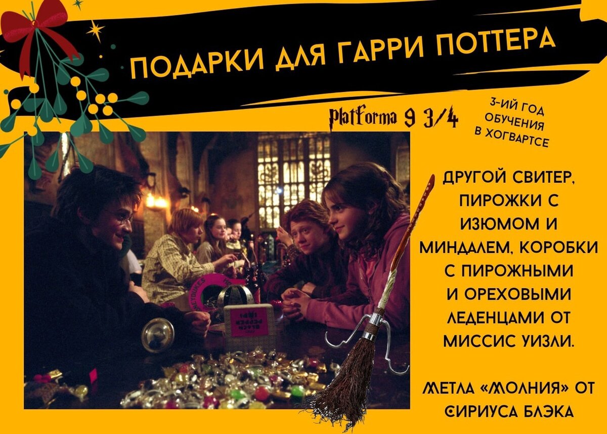 - миссис Уизли подарила Гарри свитер, ярко-красный с гриффиндорским львом, пирожки с изюмом и миндалём, пирожные и ореховые леденцы