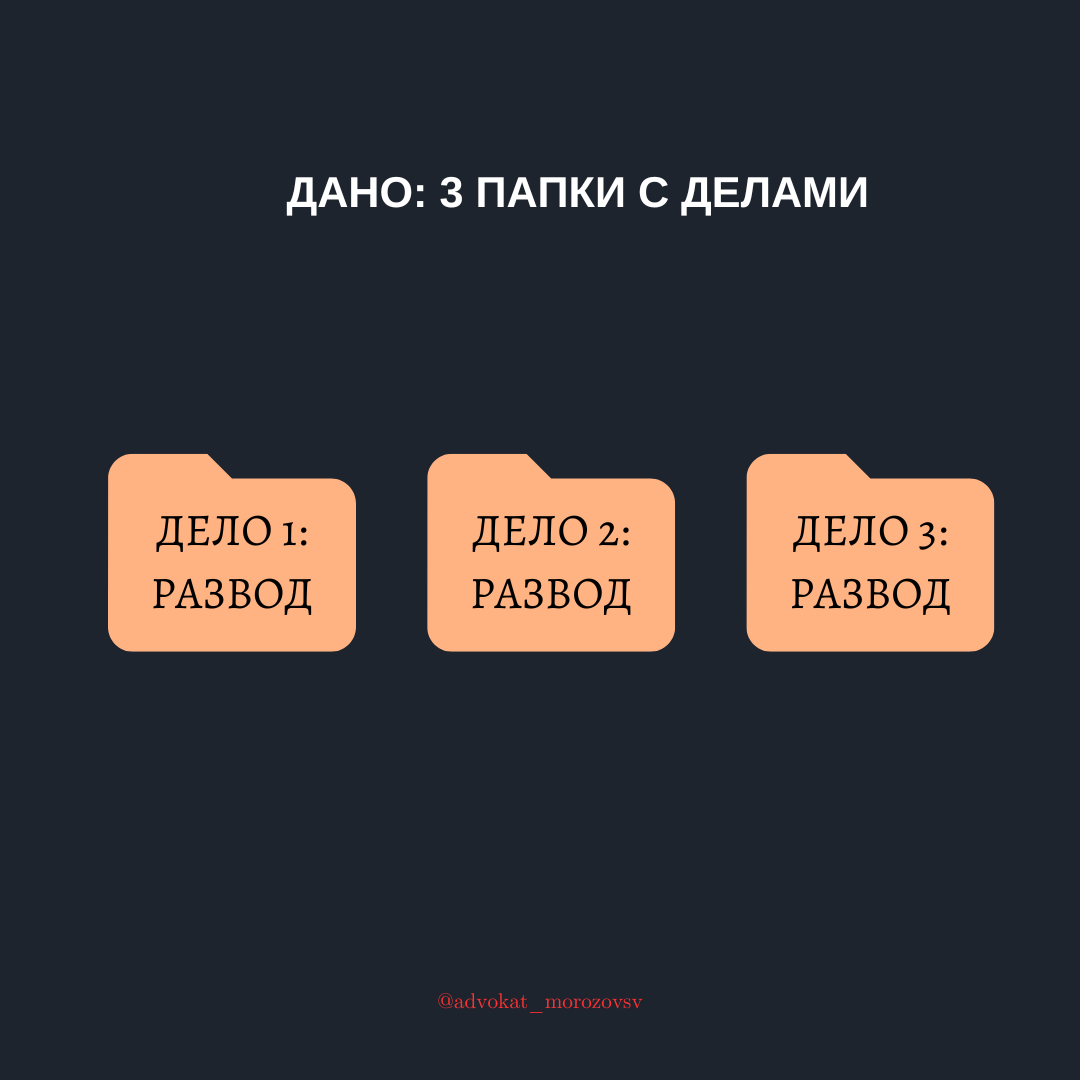 Хочу на 1 примере показать, что одинаковых ситуаций не бывает: Мы смотрим на все 3 папки и видим, что рассматриваются дела о разводе. Но если заглянуть в каждую папку, увидим: По факту 3 дела о разводе превращаются в 3 разных дела, которые рассматриваются совершенно по разному. Поэтому, когда вы ищете решение своего вопроса в интернете, спрашиваете у друзей, знакомых, хорошо подумайте, прежде чем применить к себе. Нет универсального способа для решения как разных проблем, так и схожих. Каждое дело индивидуально, каждая ситуация (хоть и выглядит похожей на предыдущие) - различная. ☝️В моей практике было такое, что даже самое незначительное обстоятельство, иногда даже малозаметное, поворачивало дело в нашу пользу. Мой подход такой: ▶️вы рассказываете свою проблему и желаемый результат; ▶️рассмотрев предоставленные вами данные (ваши слова, документы, свидетели), предлагаю варианты решения вопроса. Вы получаете четкий поэтапный план действий, придерживаясь которого мы достигаем максимума и