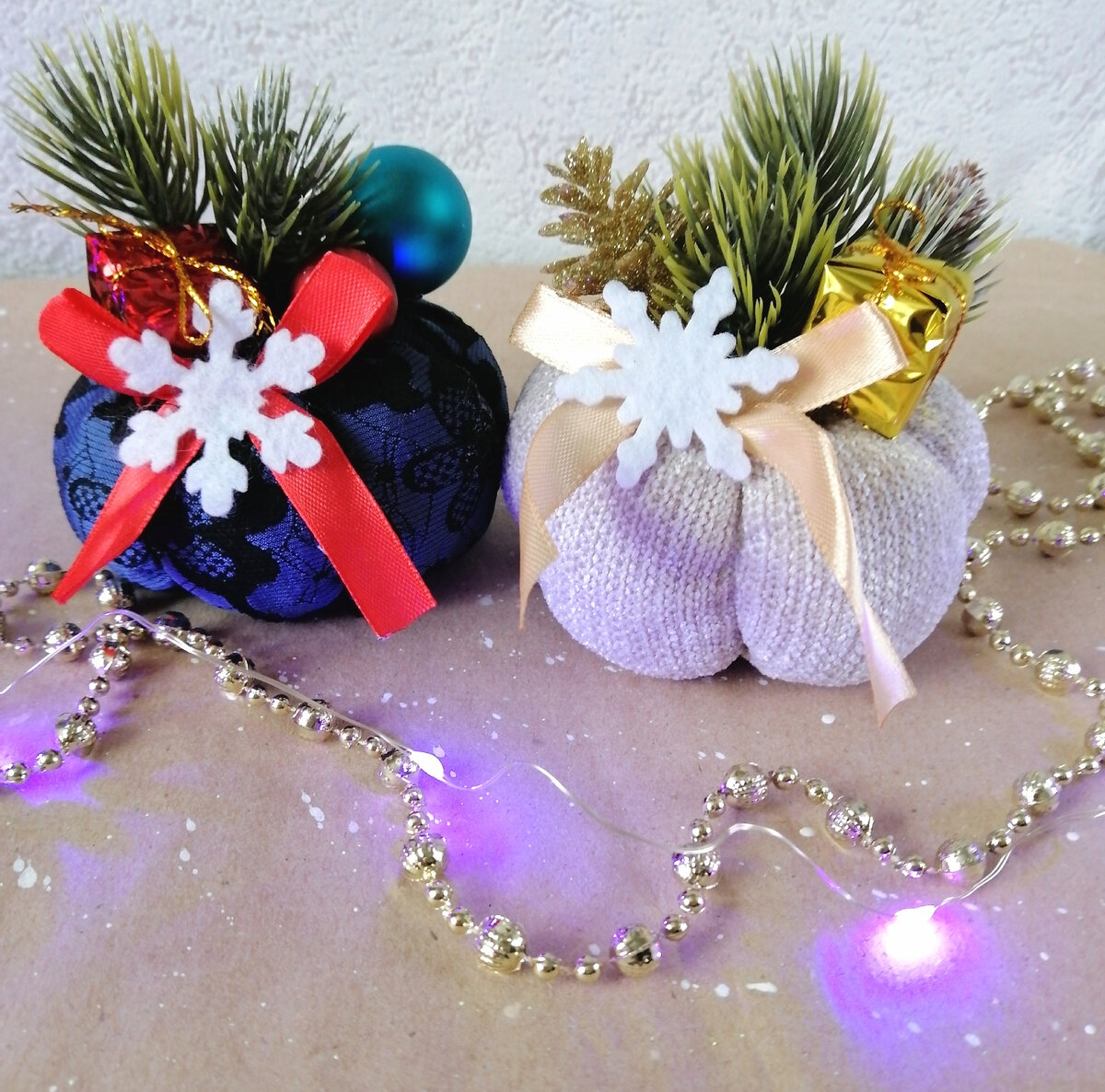 Почему бы для новогоднего декора и не использовать такие тыковки. Шить их просто и быстро, а украшать одно удовольствие. Взяла ткань размером 12 на 35 см. Лучше если это будет фактурный трикотаж, или ткань с узорами, так же можно бархат использовать. Складываем ткань по середине и сшиваем край. Нижний край стягиваем на нитку. Выворачиваем и набиваем синтепоном. Для аромата внутрь синтепон в самую середину тыквы, я ещё положила немного мандариновых корочек, пихты, гвоздики, бадьяна. Сверху стягиваем тыковку на нитку. Получается шарик. Затем берём длинную иголку и нитку. Прокалываем шарик на сквозь иглой и делаем прожилки нитками, стягивая их. Теперь наш шарик похож на тыкву. Сверху приклеиваем на горячий пистолет еловые веточки, ёлочные игрушки, снежинки, бантики и другие украшения. Из другой ткани с синим узором, получилась вот такая тыковка. Похожи на мешочки с подарками. Симпатичные и милые, украсят праздничный интерьер. Если приделать нитку, то можно повесить на елочку