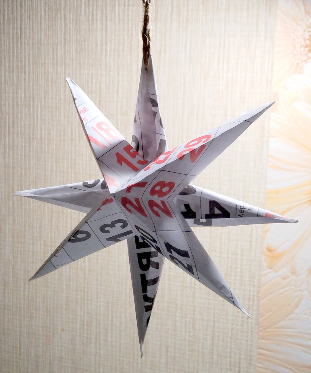 Как говорится, дело было вечером и ничем путным заниматься не хотелось. И упал мой взгляд на оторванные листки календаря... И пришла идея... И сделала я аж две звезды - немного по-разному! Звезда с округлыми лучами получилась первой. Ну так вышло! :) Нужно: два квадрата бумаги и подвес. (И клей.) Квадраты сгибаем по диагоналям и по серединам сторон. На сгибах по серединам сторон делаем надрезы на треть высоты - это самое удачное решение, а я их перепробовала-а-а... :) Бумагу подворачиваем, "завиваем" от надрезов к вершинам - как на фото. На один из каждой пары подворотов наносим клей. В один из лучей одной звезды вкладываем петельку подвеса, все лучи склеиваем. На центр наносим немного клея. Осталось склеить половинки между собой. Для надёжности можно капнуть каплю клея в вершину луча с подвесом. И вариант попроще - звезда с ребристыми лучами Начало ровно такое же: два квадрата, диагонали, половины, надрезы. Здесь я для эксперимента сделала их высотой в половину длины стороны - нет, по