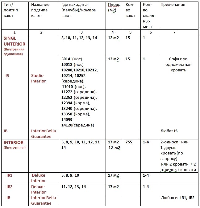 Таблица № - 1. Типы кают, подтипы кают, номера палуб расположения внутренних кают.