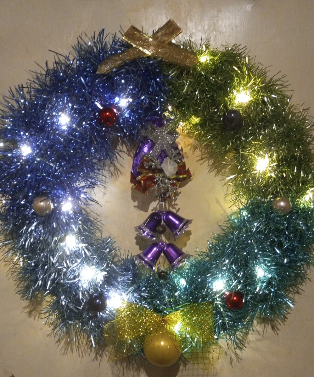 Всем здравствуйте! Совсем скоро Новый Год и пора украшать двери, окна да и вообще всё, что только можно.Вот этим мы с детками и занимаемся. Сегодня разговор пойдёт о новогодних веночках. Что же нам потребуется для его создания? Вот список, что нам пригодилось: Ну, что ж... Начнём Для начала мы разрезали коробку, боковые узкие стороны нам не нужны, а вот две длинные части как раз пригодятся. С помощью 10-ти литрового ведра начертили круг. С помощью метра, ещё один длиннее на 5см. Для начала обрезали по внешнему кругу. Используя канцелярский нож, вырезаем по внутреннему кругу. Ножничками подрезаем неровности и то же самое проделываем со второй картонкой. Должны получится две вот такие заготовочки👇 Теперь нам их нужно склеить вместе. Это необходимо для жёсткости конструкции. Если делать из одной, то будет слишком мягко. Под весом игрушек и гирлянд будет выгибаться. Мы сначала попробовали склеить двухсторонним скотчем, не тратьте скотч ни чего почти не держится!! Тут же вспомнили про