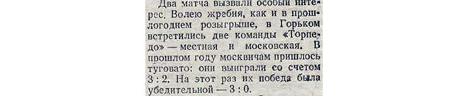 Два матча вызвали особый интерес. Волею жребия, как и в прошлогоднем розыгрыше. В Горьком встретились две команды «Торпедо» - местная и московская. В прошлом году москвичам пришлось туговато: они выиграли со счётом 3:2. На этот раз их победа была убедительной – 3:0. «Красный спорт»