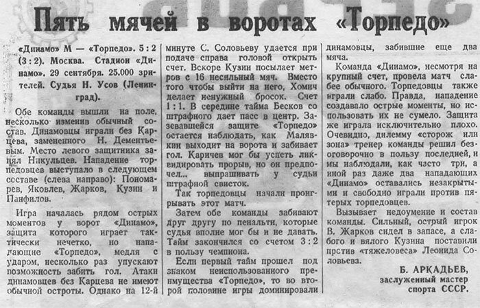 Голы: 1:0 С.Соловьев (12), 1:1 Кузин (17), 2:1 Малявкин (25), 3:1 Л.Соловьев (? с пенальти), 3:2 Панфилов (? с пенальти), 4:2 Дементьев (?), 5:2 Бесков (?). ПЯТЬ МЯЧЕЙ В ВОРОТАХ «ТОРПЕДО» Обе команды вышли на поле, несколько изменив обычный состав. Динамовцы играли без Карцева, замененного Н.Дементьевым. Место левого защитника занял Никульцев. Нападение торпедовцев выступало в следующем составе (слева направо): Пономарев, Яковлев, Жарков, Кузин и Панфилов.