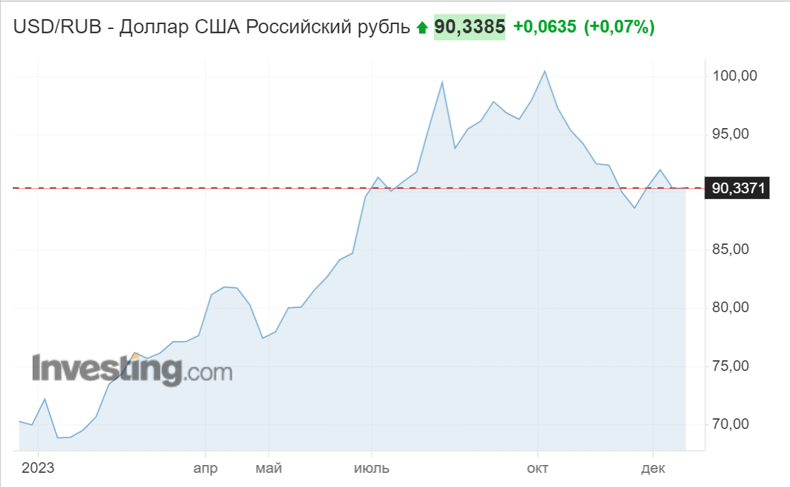 Текущий курс рубля продолжает демонстрировать стабильность, удерживаясь на уровне 90 рублей за доллар. Прошедшая неделя была насыщена событиями, оказывающими влияние на российскую валюту в декабре. Во-первых, Федеральная резервная система США и Европейский центральный банк оставили свои процентные ставки без изменений, что привело к снижению индекса доллара и поддержке рубля на несколько процентов. Во-вторых, ключевая ставка Банка России была повышена с 15% до 16%, придавая рублю дополнительную устойчивость. Важно отметить, что ранее глава Центробанка, Эльвира Набиуллина, выражала готовность продолжать повышение ставок до тех пор, пока не убедится в устойчивом снижении инфляции в России. Однако ее последние заявления свидетельствуют о смене риторики, предполагая завершение политики повышения ключевой ставки, хотя подчеркивается зависимость от дальнейших данных по инфляции.