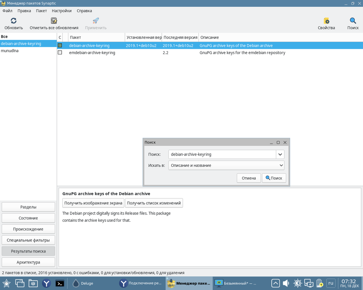 В репозиториях Астры, не все программы, которые есть в Дебиане. Это наверное связанно что не все программы разработчики успевают перепроверять и не за все отвечают. Все дело в безопасности. Но так как мы знаем что сам Дебиан, одна из самых безопасных систем. То смело ставим его репозитории. Сначала нужно скачать ключи. Идем в Сунаптик, находим в поиске ключи и устанавливаем. debian-archive-keyring Дальше идем Настройки - Репозитории и добавляем. Жмем Новый и заполняем строчки на скрине. Жмем Ок и обновляем списки пакетов. https://deb.debian.org/debian/