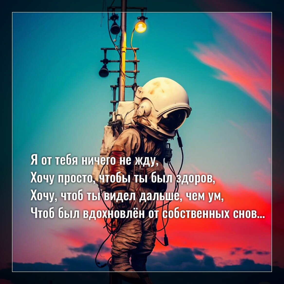 Я от тебя ничего не жду, Хочу просто, чтобы ты был здоров, Хочу, чтоб ты видел дальше, чем ум, Чтоб был вдохновлён от собственных снов. Хочу, чтоб тревогу внутри убрал, Она ни к чему, только видеть мешает Сердцем, пусть там будет только любовь, Душа, как сирень пусть расцветает. И жалоб не будет, а лишь благодарность Сочится сквозь каждый твой на Земле вдох, Тебя не прошу быть твердым как камень, Всегда тебя выслушать честно готов, Но не уходи в излишнюю жалость, Хорошего мало в этом обычно, О том, сколько преодолеть ты способен, Потом расскажу тебе в тишине лично.