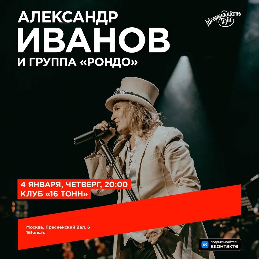 ⚡Друзья! Напоминаем вам, что в Новом 2024 году, 4 января, состоится наш зимний концерт на сцене уютного московского клуба «16 Тонн»! Не упустите шанс провести яркий музыкальный вечер!💥 ❗🎫 Билеты: ➡️️ https://clck.ru/36jXd9 📌 Адрес: Пресненский Вал, д. 6, стр. 1 ☎ +7 (499) 253 53 00 #АлександрИванов #Рондо #ГруппаРондо #Москва #Клуб16Тонн #ЗимнийКонцерт