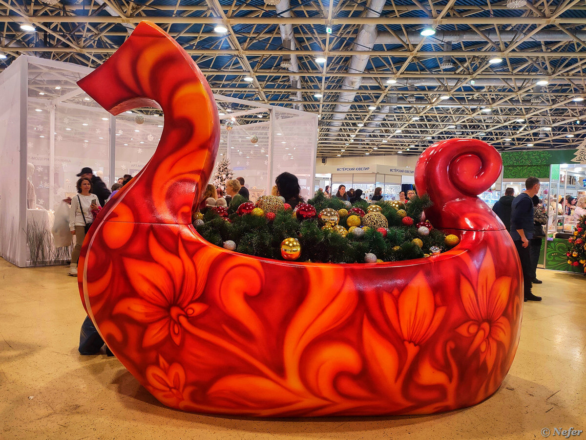 Это крупнейшая выставка-ярмарка народных художественных промыслов России. Причем представлены и традиционные ремесла, и современные авторские изделия. Участвуют более 50 регионов, в том числе отдаленные, типа Бурятии, Удмуртии, Чувашии, Хакасии и Камчатки. Конечно, перед Новым годом было много елочных игрушек и праздничных украшений. А Камчатка привезла рыбу и красную икру. Выставка-ярмарка "Ладья" проходит в Экспоцентре, в этот раз она занимала шесть залов. Исходя из опыта предыдущих лет, я понимала, что всю ее не обойти, поэтому изучила схему стендов и выбрала то, что меня интересует. На фото одуванчики, сделанные в мастерской Колесникова. Как настоящие! Потрясающие елочные игрушки, просто произведения искусства! Стенд называется "Кукла.35", они есть на VK. Мое внимание привлекла фигурка персонажа из мультфильма "Падал прошлогодний снег". Рядом с ним Дед Мороз, помните, откуда он? Игрушки красивые, цены соответствующие, каждая стоит 6000 рублей. Только печка 3500, она осталась от наб