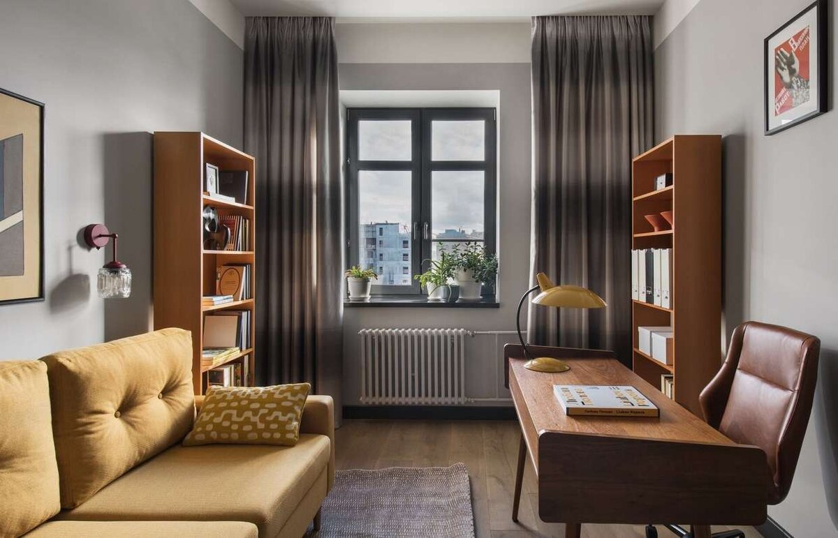 Очень уютный интерьер со множеством классных решений Дизайнер Алиса Каштанова в своей трехкомнатной квартире оформила классный кабинет с исторической атмосферой. Рассказываем об особенностях обустройства этого элегантного и комфортного рабочего помещения. В отделке и меблировке ставку сделали на эклектичный дизайн — винтажные и современные предметы вписаны очень удачно. Цветовая гамма составлена из сложных оттенков серого, а акценты расставлены с помощью мебели из натурального дерева. Кабинет предназначен не только для работы, но и для отдыха. Здесь останавливаются гости — для них предусмотрели раскладной диван. На полках стеллажей рядом с книгами разместили линогравюры, передающие настроение энтомологических коллекций и гербариев, от художницы Анны Самойловой. Обращает на себя внимание консольный письменный стол. Кожаное кресло задает настроение и мотивирует к творчеству. Линия прошлого «тянется» через мебель и декор: ретролампа на столе, советские плакаты, живопись — в кабинете макси