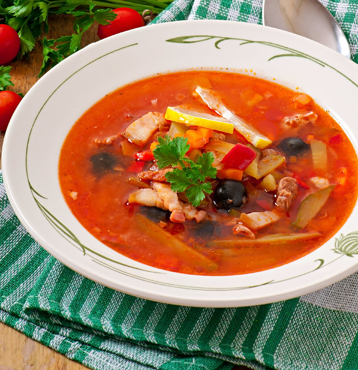 Ингредиенты: Бульон - 3 л (мясной или куриный) Бекон сырокопченый - 150 г Колбаса варенокопченая - 200 г Лук репчатый - 1 шт Морковь -1 шт Томатная паста - 100 г Картофель -3-4 шт Маслины - 200 г Огурцы маринованные - 5 шт Лимон - 3 кружочка Петрушка - 3 веточки Соль по вкусу Сметана 20% - для подачи Приготовление: Нарезаем бекон, колбасу. Лук нарезаем мелким кубиком. Морковь натереть на терке. Обжариваем бекон. Добавляем лук. Немного обжариваем и добавляем колбасу также нарезанную. Добавляем морковь и ещё немного обжариваем. Добавляем томатную пасту. Ещё немного обжариваем. Перекладываем в кастрюлю. Заливаем бульоном. Добавляем картофель, маринованные огурцы и маслины. Солим по вкусу. По желанию можно добавить перец чёрный молотый. Варим до готовности картофеля. Подаем со сметаной ,зеленью и кружочком лимона. Приятного аппетита!!! Не забывайте подписываться на канал, чтобы не пропустить новые публикации.