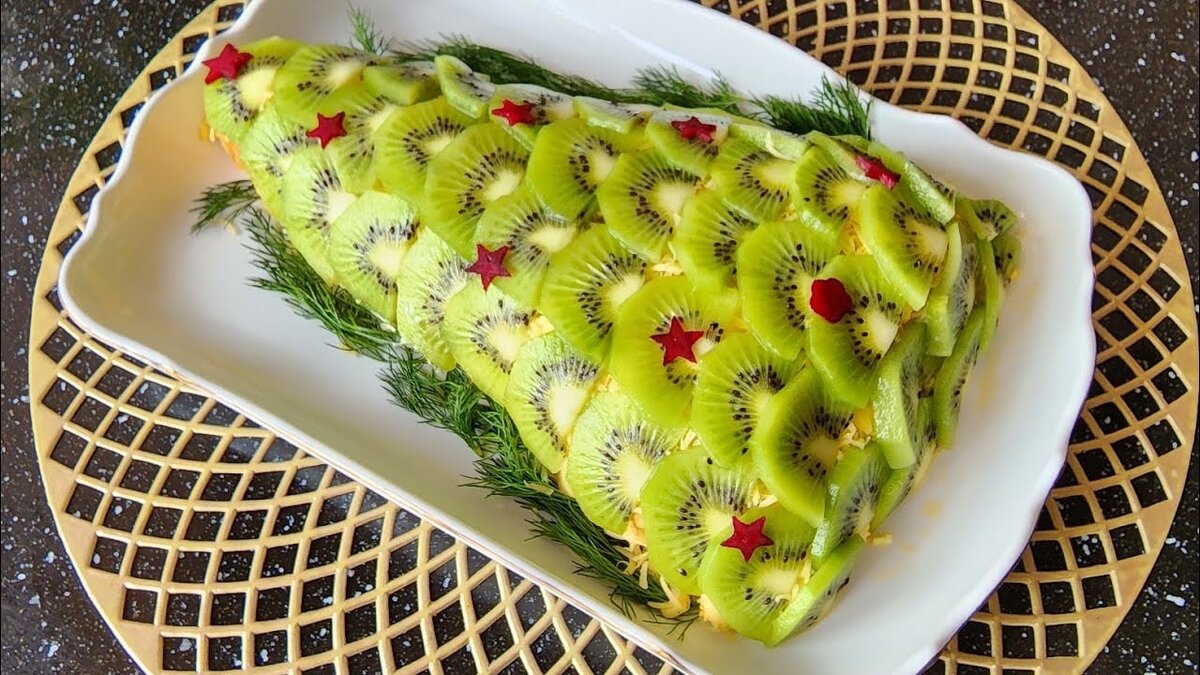 Соедините все ингредиенты, кроме киви. Добавьте соль и майонез. Выложите массу на плоскую тарелку, придайте ей форму ёлки. Начните украшать салат кусочками киви. Дайте блюду настояться в холодильнике, что позволит ему лучше пропитаться. Приятного аппетита!
