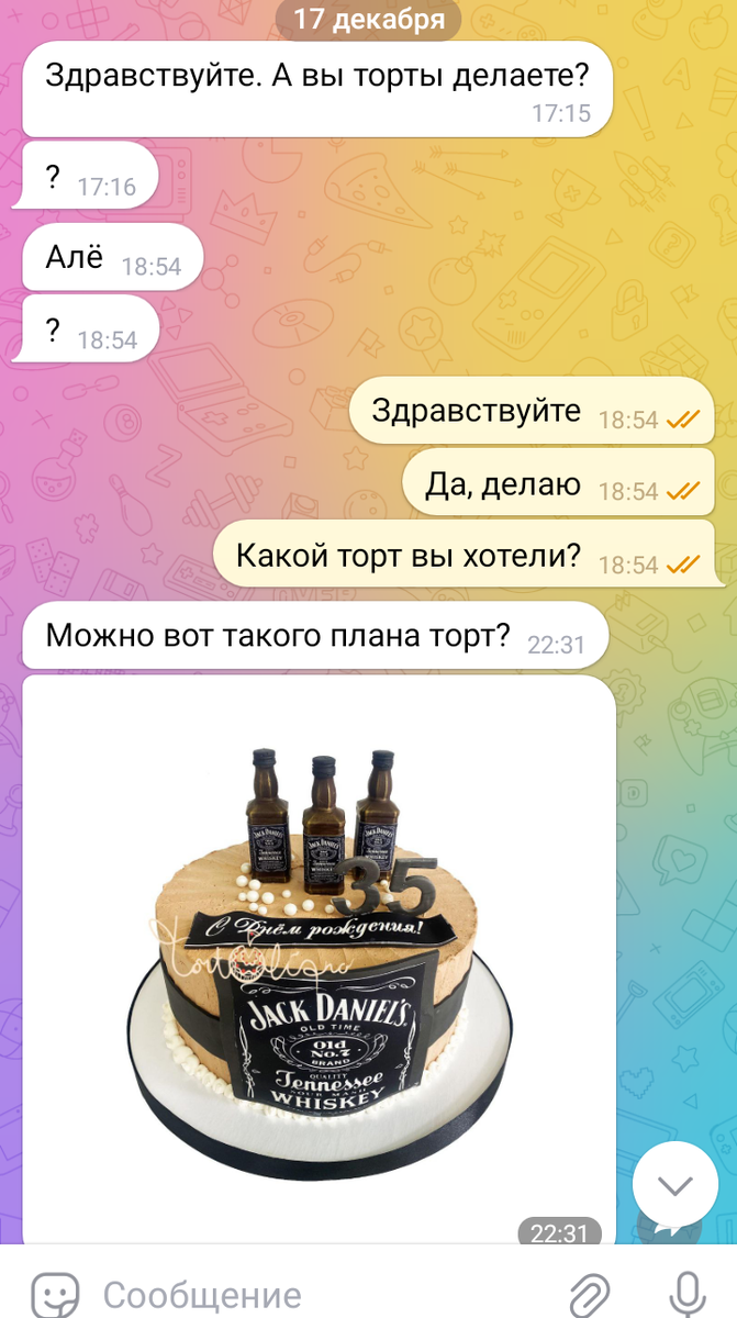 Ох, какая у меня тут заказчица попалась... Хотела получить и услуги кондитера и услуги экстрасенса одновременно 🤔 Я не ожидала такого финала, хотя изначально манера общения меня напрягла. Я конечно задержалась с ответом, но бывают такие ситуации, когда просто физически нет возможности зайти на страничку. А у меня на тот момент телефона вообще под рукой не было. Кстати, заказчица после моего ответа сама далеко не сразу на связь вышла. Обычно я поздно не отвечаю, но тут решила принять заказ. В точности не всегда есть возможность выполнить заказ по некоторым причинам: если нет подходящей формы, если нет вафельной картинки. У меня не было формы для бутылочки коньяка, но всегда можно что то поменять и найти решение. (Клубнику я на данное время найти не смогу🤷♀️) Вроде всё обговорили, всё решили. Заказ понятен. Вес правда изначально очень маленький хотели. Удалось уговорить увеличить только на 500 грамм🥴 Очень интересная информация в пол первого ночи поступила об одобрении мужа.