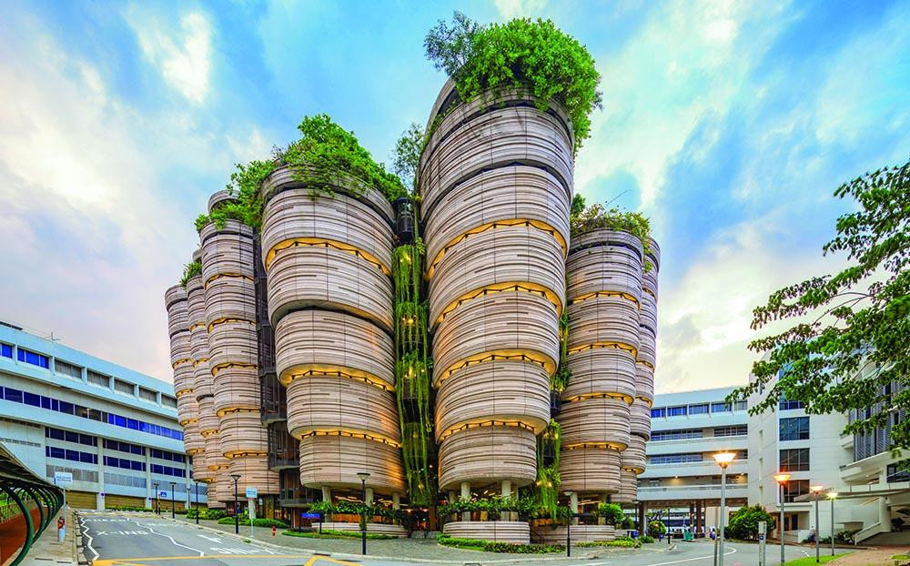 Кампус Наньянского технологического университета начали возводить в Сингапуре ещё в 80-ых годах прошлого столетия. В работе принимал участие всемирно известный японский архитектор, будущий лауреат Притцкеровской премии Кэндзо Тангэ. Среди построек самая необычная – учебный корпус, его называют «улей». Оно состоит из 12 башен, которые находятся внутри атриума. Внутри здания аудитории не имеют углов и могут трансформироваться в зависимости от нужд студентов и преподавателей. Озелененные террасы и балконы – общественные пространства.