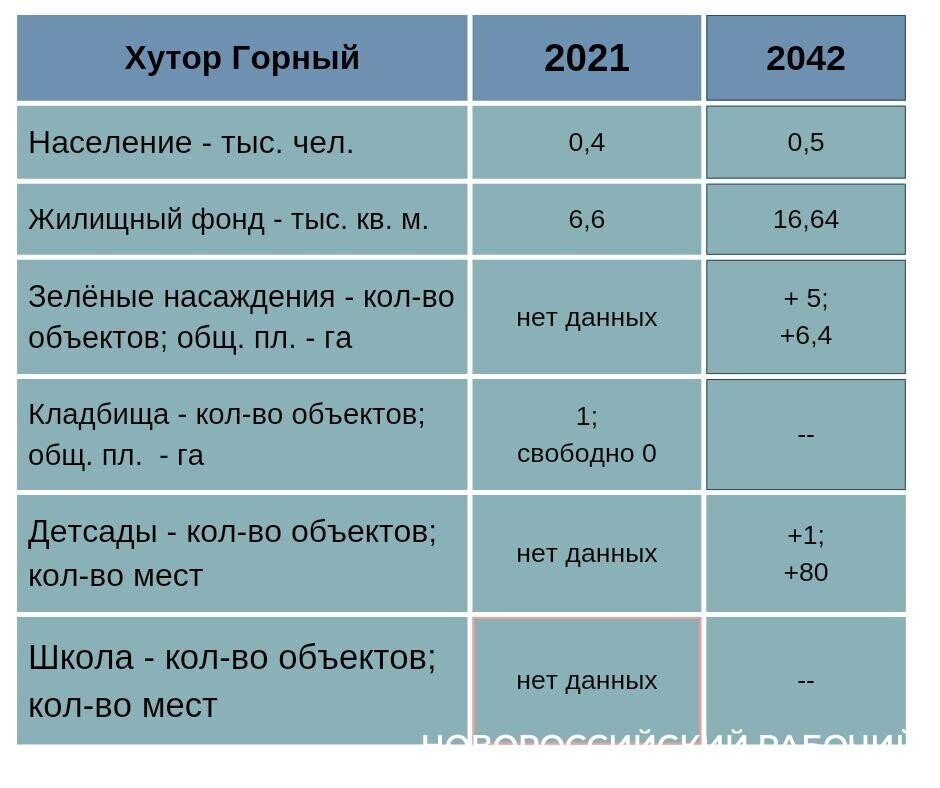 Слушается Генплан Новороссийска. Что будет через 20 лет. Гайдук и хутор Горный На общественных слушаниях по проекту изменений в генплан Новороссийска, которые идут по очереди в разных местах города и пригорода уже неделю, для многих горожан важно понять, какой статус будет у их участка. Вполне вероятно, что участники этих встреч не обращают внимания на то, каким будет каждый из 25 населенных пунктов и районов муниципального образования. Заглянем в эти планы! В коротких пояснительных записках о планируемых мероприятиях в границах населенного пункта разработчики генплана рассказали, с чем придет, по их прогнозам, к 2042 году каждый внутригородской район, село, поселок, хутор, станица. За основу брались данные на 1.01.2021 года (правда, не во всех пояснительных записках они приводятся). Так, питерские проектировщики приводят данные о том, сколько квадратных метров жилья в конкретном населенном пункте сейчас и сколько будет через двадцать лет, в 2042 году. По некоторым позициям обозначены