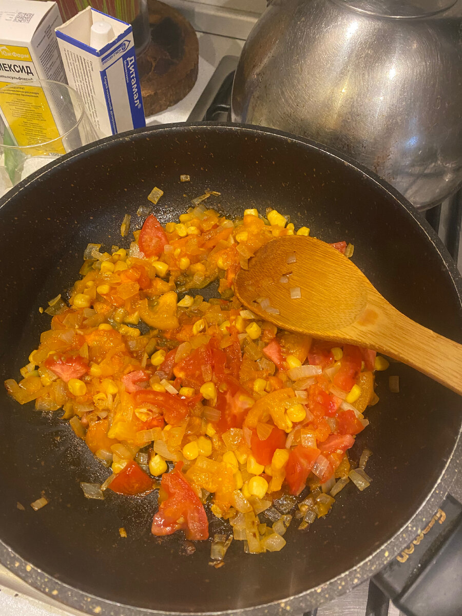 Фритата - это итальянский омлет с сыром, приготовленный в духовке. Начинка может быть любая: грибы, мясо, колбаса, овощи - в общем, все, что есть в холодильнике. Нам потребуется: Для омлета: 4 яйца примерно 50 мл. молока соль перец горсть тертого сыра. веточка свежей петрушки Для начинки: 1 луковица 3 зубчика чеснока 3 помидоры треть банки кукурузы 1 столовая ложка оливкового масла 200 грамм сыра фета Нарезаем лук и чеснок мелким кубиком. Помидоры, если некрупные, то четвертинками. Крупные помельчьте. Все нарезанные овощи вместе с кукурузой обжариваем на оливковом масле. Перекладываем в смазанную форму для запекания. Для пикантности я добавила несколько кусочков сыра типа пармезана. Венчиком взбиваем яйца с молоком, солим и перчим. Добавляем горсть тертого на мелкой терке сыра. Фету нарезаем кубиком. Яично-сырную смесь выливаем в форму и украшаем кубиками феты. Ставим в духовку 180С на 30 минут. Готовую фритату посыпаем крупно нарезанной петрушкой. Приятного аппетита!