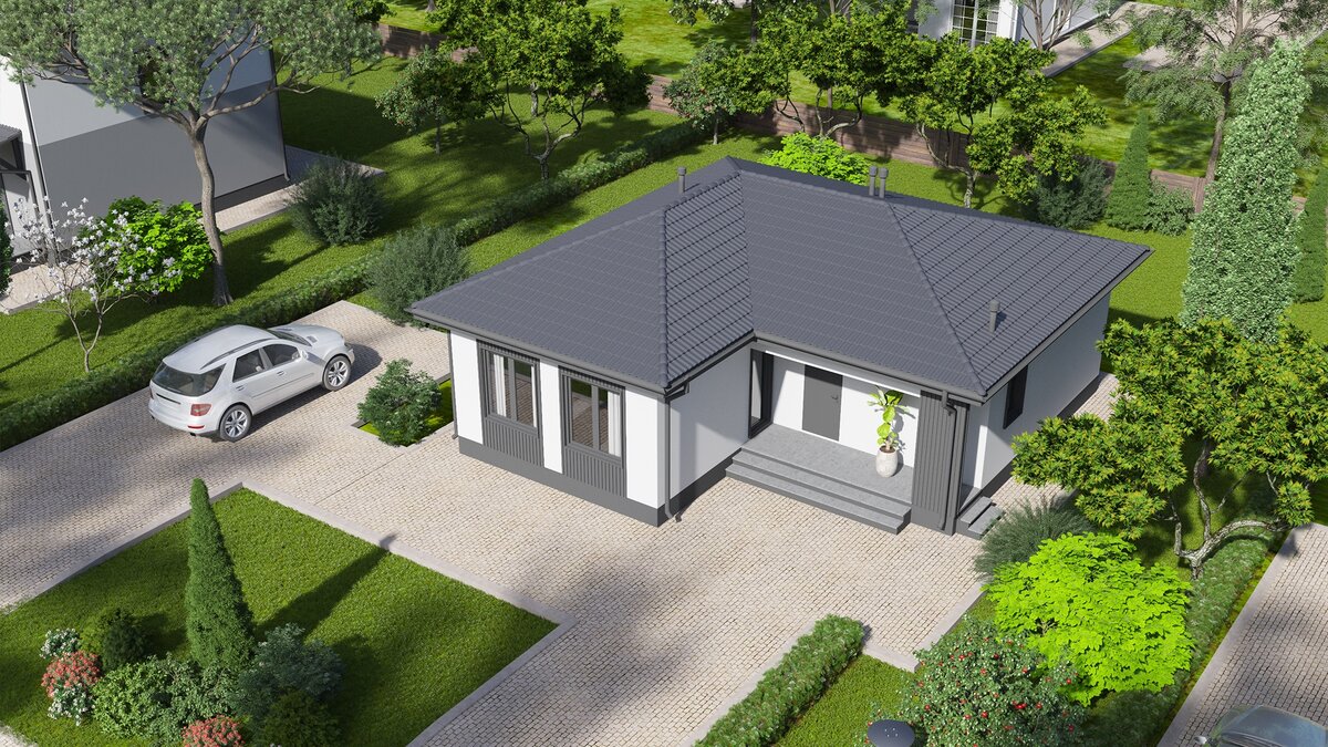 Одноэтажный дом «Турин–48» — небольшой, но очень комфортабельный проект, позволяющий жить в нем круглый год семье из 2 или 3 человек. На общей площади в 64,09 м² размещены: кухня-студия, гостиная с выходом на пристроенную террасу, спальня, полноценная ванная комната и прихожая. Это идеальный дом для строительства на небольших участках.