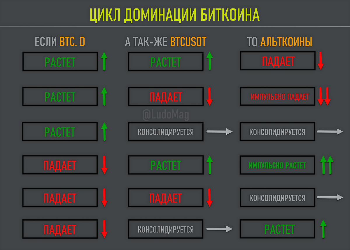 Доминация (BTC.D) отображает взаимосвязь между направлением движения разных криптовалют.