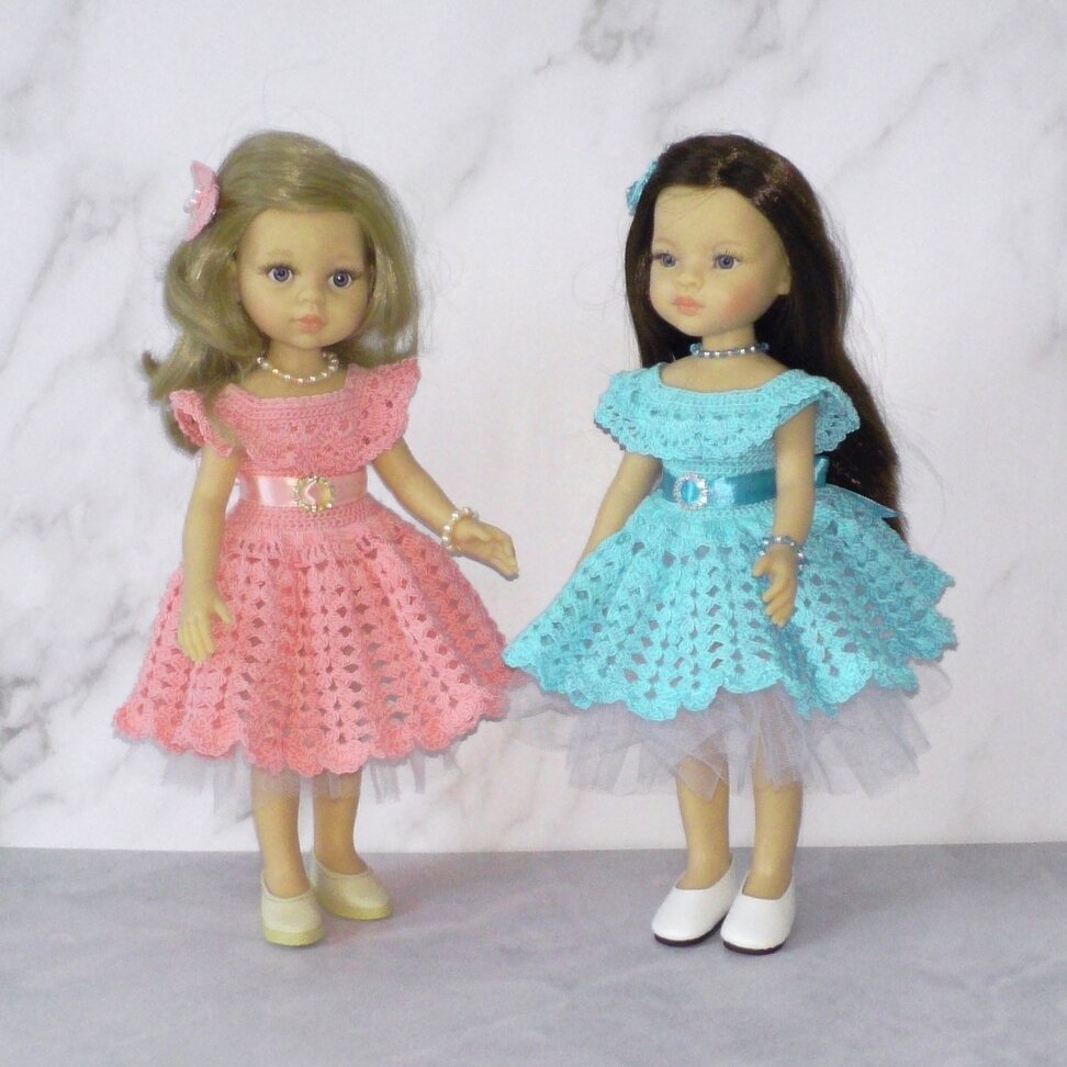 От вязания игрушек и одежды для них перешла к вязанию одежды... для кукол. Ага, вот так вот, внезапно)) Все началось с того, что мне захотелось связать нарядное (читай-вечернее) платье, например, для встречи Нового года. Игрушечное, конечно. Представьте себе вечернее платье на мишке... ну это как-то косолапо... не комильфо в общем. И тут случайно увидела у кого-то на фото коллекцию кукол Паола Рейна (Paola Reina) в чудесных платьях и нарядах. Картинка сложилась! В детстве у меня была всего одна кукла (жили мы скромно) и та без туфелек, потерялись где-то. И мы с бабушкой шили на нее наряды из лоскутков, ну то есть бабушка шила, а я помогала по мере сил. Я очень многому научилась у бабушки, вся моя любовь к рукоделию - от неё, и я бесконечно ей за это благодарна. Появились у меня две Паолочки - Мали и Кэрол. Пока связала им нарядные платья, в планах сарафаны, брючки, кофточки и что-нибудь еще интересное. Добавила украшения и заколочки, бисера и бусин у меня много. Может и шить начну, по